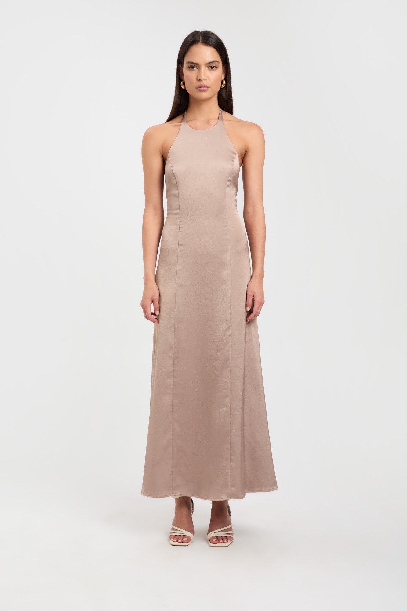 Make heads turn in this elegant silhouette. Rendered in a stunning bronze hue. this maxi length dress draws attention with its striking open low back that finishes with its keyhole tie feature. Crafted from satin. the dress emphasises its timeless silhouette with its fitted tank bodice which flows into a relaxed hemline.
