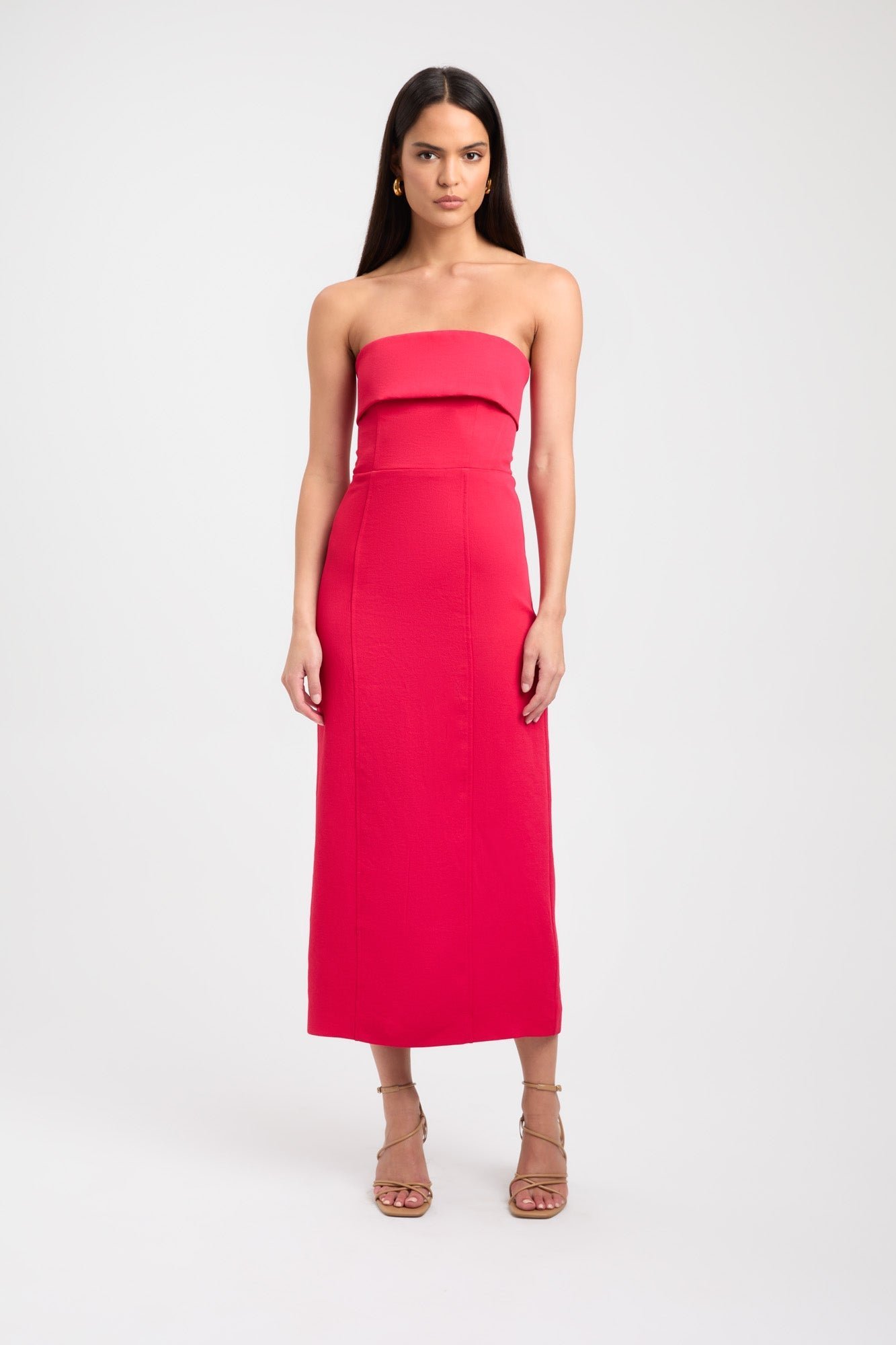 Inject a pop of colour to your formal edit with the Oyster Strapless Midi Dress. Made from our Oyster fabrication. this form-fitting design features a strapless neckline. corset-like bodice and cinched waistline. Rendered in a Cherry Red colourway. this midi style completes with a column skirt evoking sophisticated appeal.